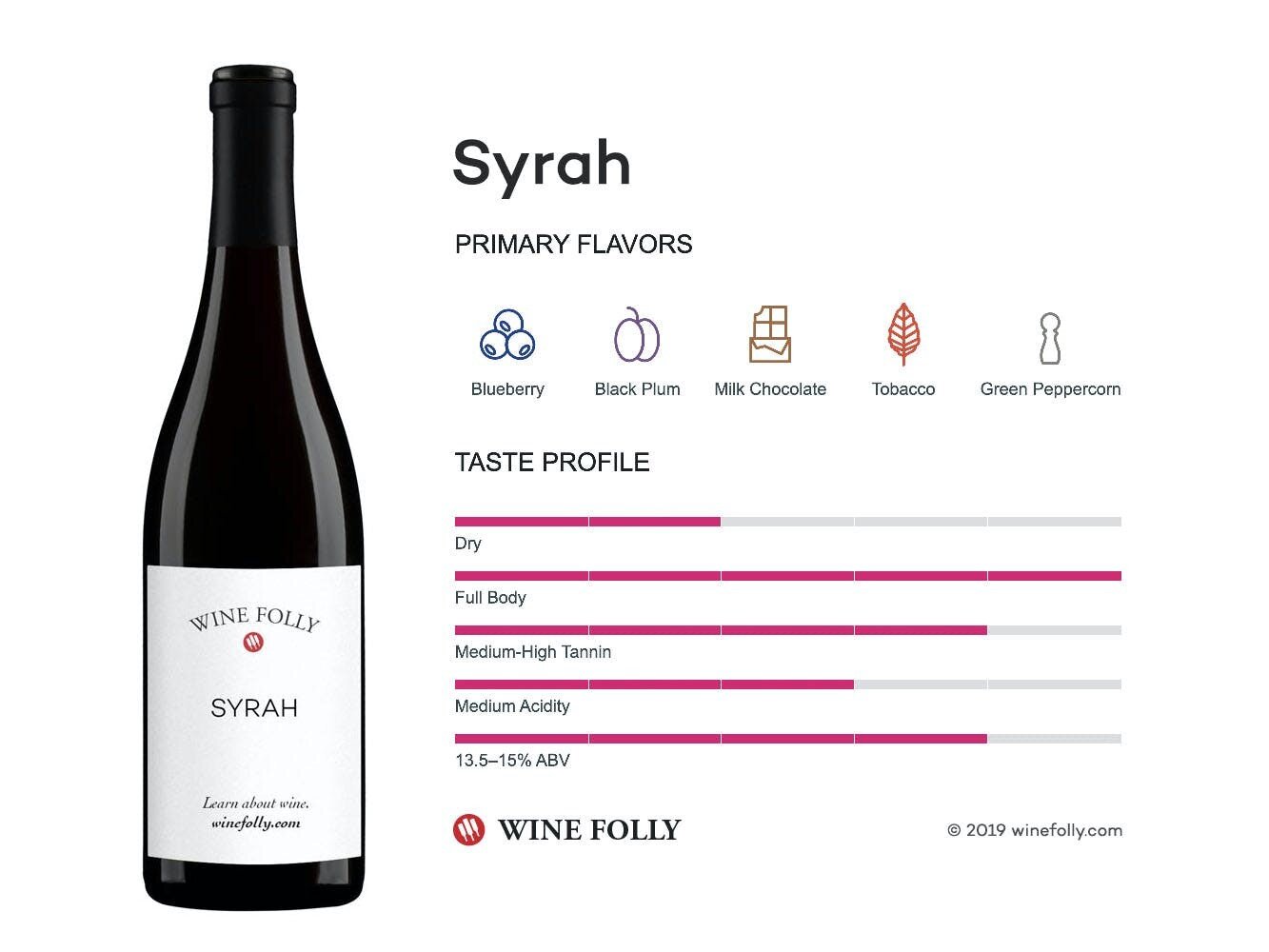 Kenmerkend voor deze druif zijn de stevige tannines en een goede zuurgraad, wat bijdraagt aan het bewaarpotentieel van de wijnen. In sommige regio’s, zoals de Barossa Valley in Australië, kan Syrah (Shiraz) wijnen voortbrengen met rijpe, zwoele fruittonen en een voller mondgevoel.
