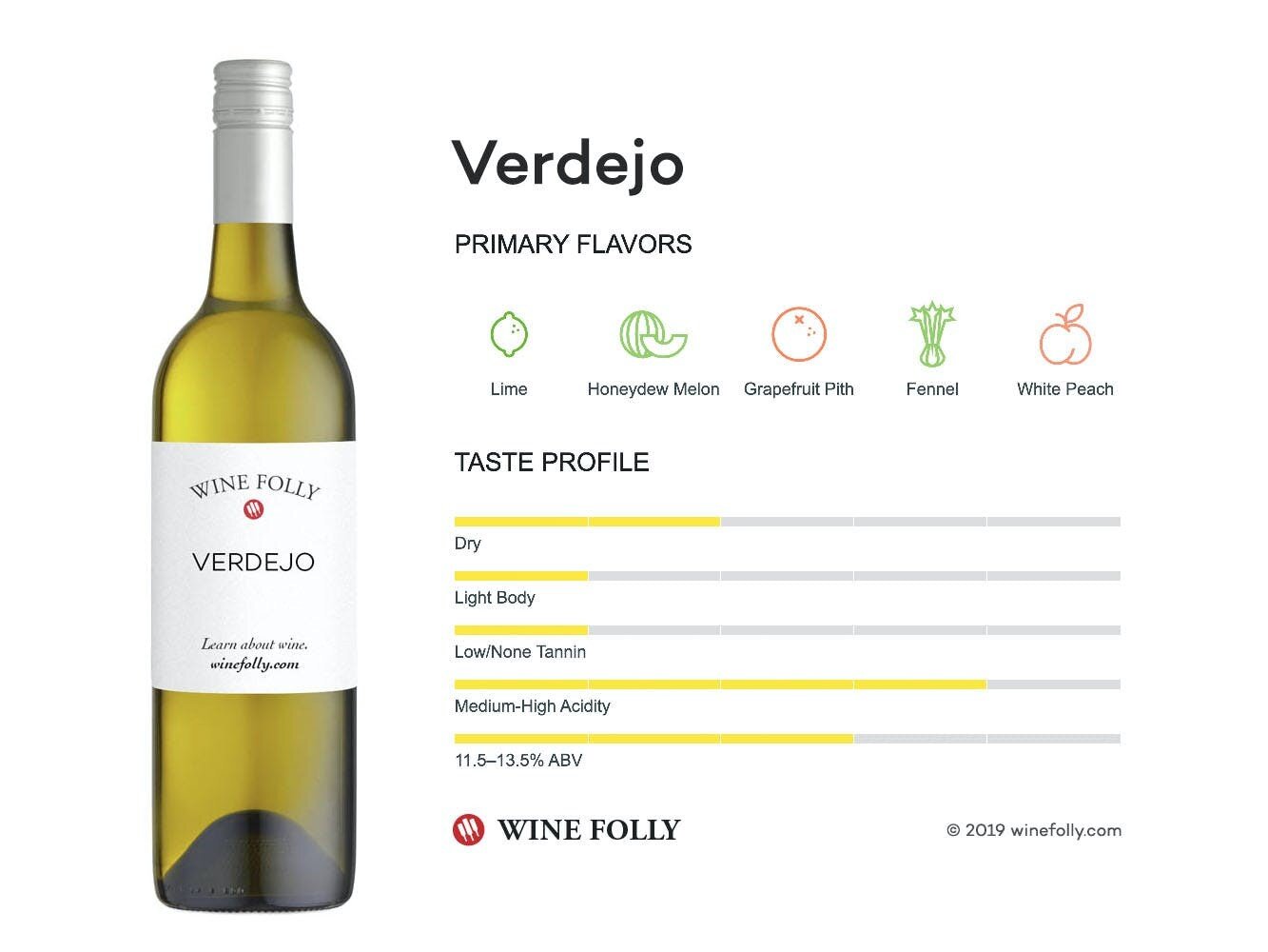 De Verdejo-druif gedijt goed in het warme klimaat van Rueda en wordt vaak gevinifieerd als een op zichzelf staande variëteit. Hierbij de nadruk ligt op de fruitige en bloemige eigenschappen. Deze wijnen zijn geschikt als aperitief en gaan goed samen met zeevruchten, salades en lichte gerechten.