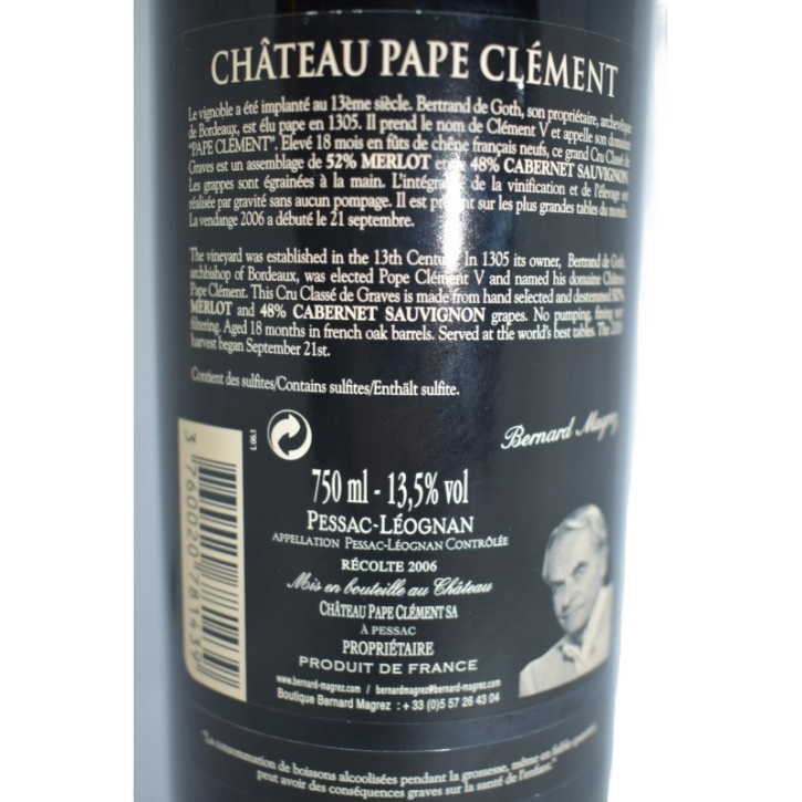 Château Pape Clement is één van de oudste châteaux in Bordeaux en dateert uit de 13e eeuw. Het is het eerst verworpen wijngoed van Bernard Magrez, die in 2009 uitgeroepen werd tot Wijnmaker van het Jaar. Bernard Magrez werkt al 40 jaar met veel passie en ervaring aan het produceren van de beste wijnen. Hij bezit meer dan 35 wijngaarden over de hele wereld en staat garant voor elke wijn die onder zijn bezielende leiding gemaakt wordt. Vervolgens op Pape Clement worden sinds 2001 alle druiven van het gehele domein handgeplukt en handmatig ontsteeld. De productie is laag, slechts 28 houten vaten, maar de kwaliteit is van het hoogste niveau. 18 maanden op Frans eiken gelegen.