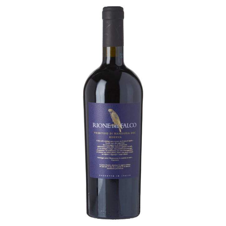 De valk op de fles van Rione del Falco Primitivo di Manduria Riserva staat symbool voor de kracht van visie, wijsheid en bescherming.