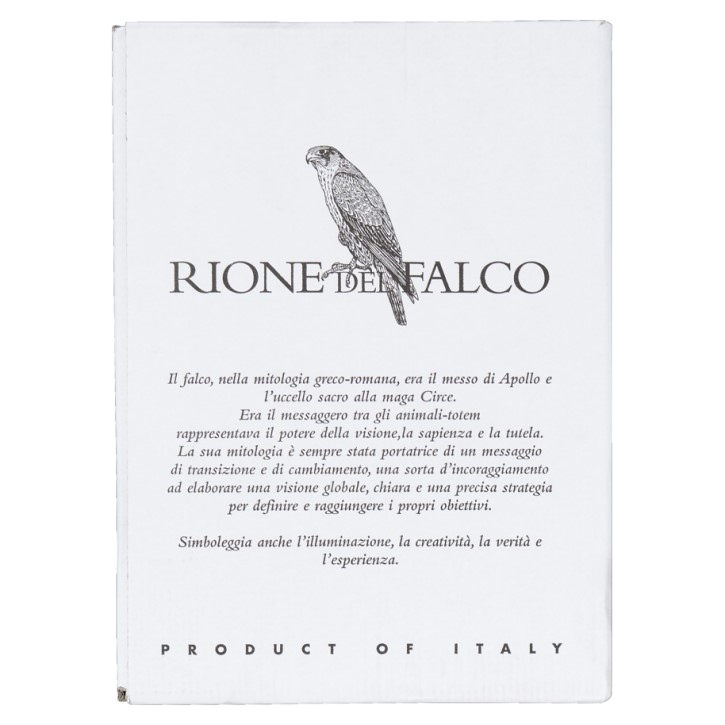 De valk op de fles van Rione del Falco Primitivo Rosso staat symbool voor de kracht van visie, wijsheid en bescherming.